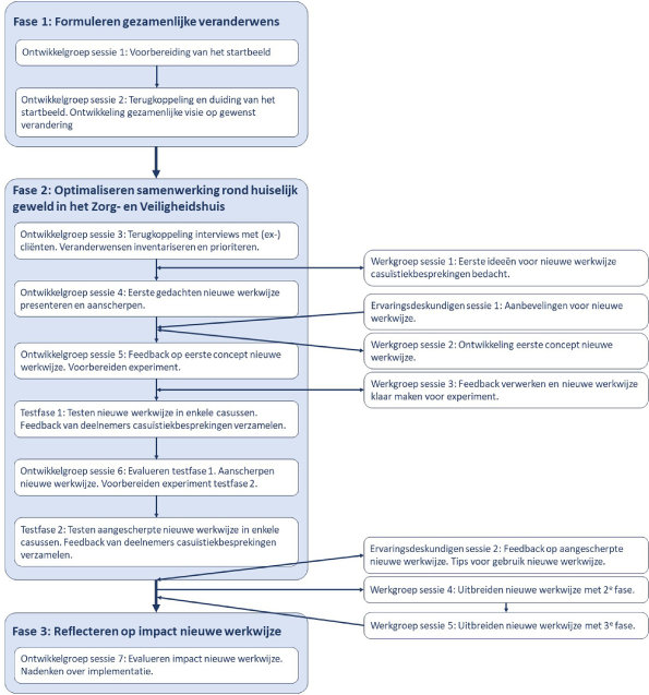 In participative action research, we worked with a broad range of professionals on improving the shared analysis and assistance planning. Professionals worked at the police, prosecution, probation, child protection, care agencies focused on domestic violence, forensic mental health care and the Care and Safety House. The professionals met in six (online) meetings to learn and to improve assessment and decision-making processes in their case discussions.