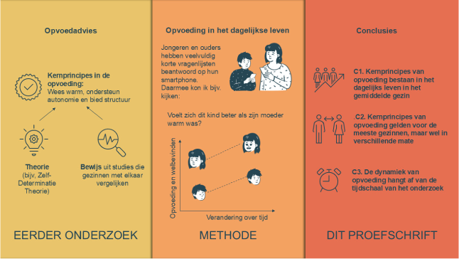 Het proefschrift van Anne Bülow, waarover deze samenvatting gaat, heeft universele opvoedprincipes in het dagelijkse leven aangetoond, die een belangrijke basis voor opvoedadvies kunnen vormen: Jongeren voelden zich gelukkiger op momenten en dagen dat hun ouders meer warmte tonen en autonomie bevorderen. Hoe sterk deze opvoedprincipes in elk gezin aanwezig waren, varieerde sterk van gezin tot gezin. Dit benadrukt het belang van gepersonaliseerd opvoedadvies. De sterkte van de opvoedprincipes hing ook af van de tijdschaal waarop ze werden geobserveerd (bijvoorbeeld moment, dag, of week). Toekomstig onderzoek moet uitwijzen of opvoedadvies dat op de korte termijn werkt misschien averechtse effecten op de lange termijn heeft of andersom.